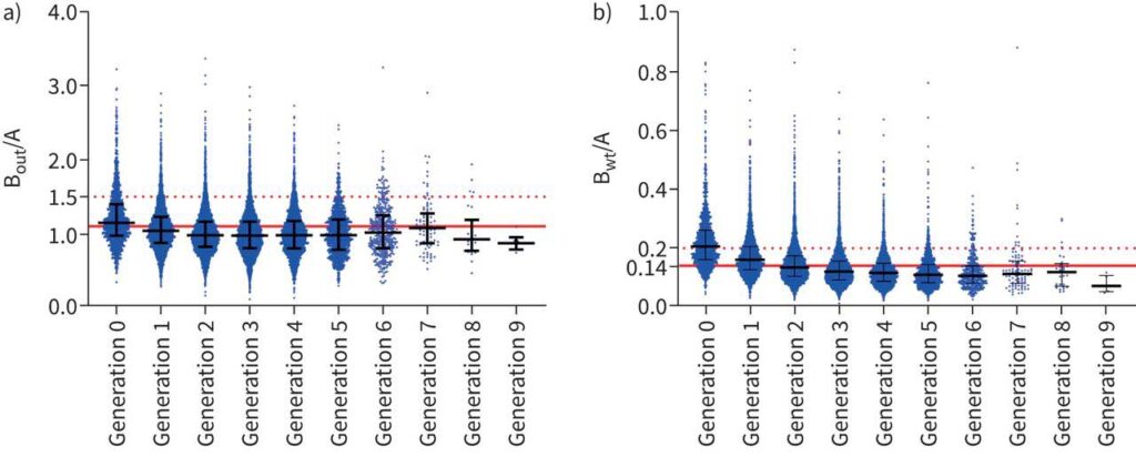 Bronchus–Artery ratios measured by LungQ-BA software. Blue dots represent individual measurements of the Bout/A, and Bwt/A ratio. The two figures show the relation between the different measurements, starting at the segmental level (generation 0) up to the 9th segmental generation, deep down in the lungs. Dots above the solid red line are dilated (Bout/A) or thickened (Bwt/A).