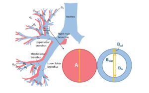 Although computed tomography is a very sensitive and non-invasive method allowing for visualization of mucus impaction in both large and small airways, it is a major challenge to visually measure airway wall thickening, airway widening (bronchiectasis) and to detect mucus plugs based on chest CTs. The airway wall thickness as can be observed on a chest CT, represents thickening of the wall caused by inflammation but also of the mucus adhered to the wall.