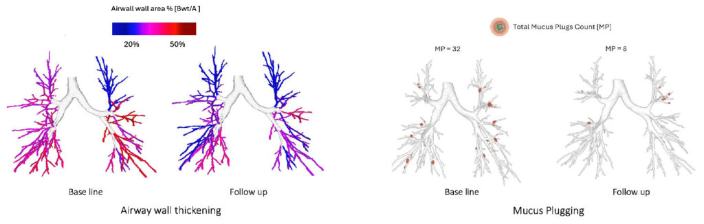We can identify patients with predominantly mucus-dominated phenotypes versus those without mucus plugs but with severe wall thickening or subtle peripheral bronchial dilation. We can track disease activity over time and visualize the impact of a treatment at the segmental level. We no longer need to infer what’s happening – we can measure it.
